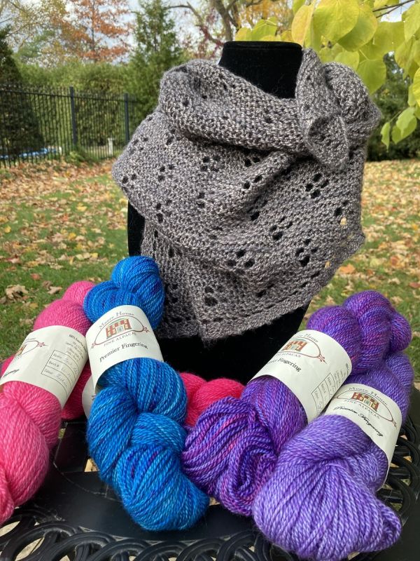 Yarn is 100% alpaca or a blend of alpaca with up to 15% soy silk, bamboo, and/or superwash merino.