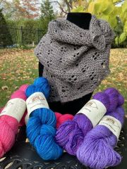 You may select either 50g or 100g skeins, enough for knitting any number of lace scarf patterns you can choose from your own sources. Check your pattern's yardage requirements. This yarn comes skeined. If you wish it to be wound into a centre-pull ball, please send me an email with this request.